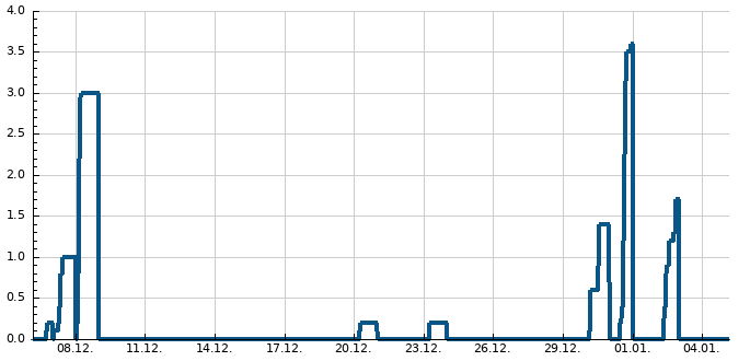 Graf zobrazuje výšku sněhové pokrývky v průběhu měsíce, šedou čárou jsou znázorněny dlouhodobé průměry pro daný den.
