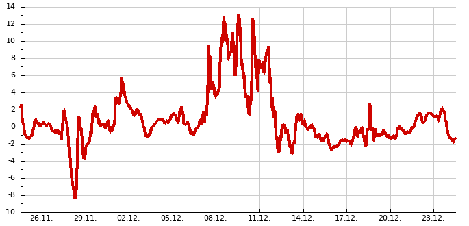 Spojnicový graf udává průměrnou rychlost větru změřenou za 10 minut v km/h, sloupcový graf zobrazuje nárazy větru (zobrazeny jen pokud přesáhnou 40 km/h).