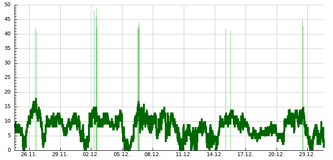 Spojnicový graf udává průměrnou rychlost větru změřenou za 10 minut v km/h, sloupcový graf zobrazuje nárazy větru (zobrazeny jen pokud přesáhnou 40 km/h).