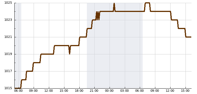 Spojnicový graf udává nejvyšší zaznamenanou průměrnou rychlost větru změřenou za 10 minut v km/h, sloupcový graf zobrazuje nejvyšší zaznamenané nárazy větru (zobrazeny jen pokud přesáhnou 40 km/h).