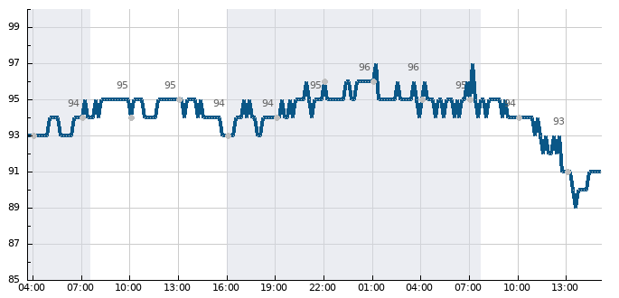 Spojnicový graf udává nejvyšší zaznamenanou průměrnou rychlost větru změřenou za 10 minut v km/h, sloupcový graf zobrazuje nejvyšší zaznamenané nárazy větru (zobrazeny jen pokud přesáhnou 40 km/h).