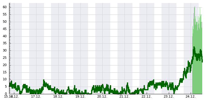 Spojnicový graf udává nejvyšší zaznamenanou průměrnou rychlost větru změřenou za 10 minut v km/h, sloupcový graf zobrazuje nejvyšší zaznamenané nárazy větru (zobrazeny jen pokud přesáhnou 40 km/h).