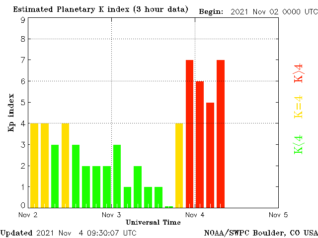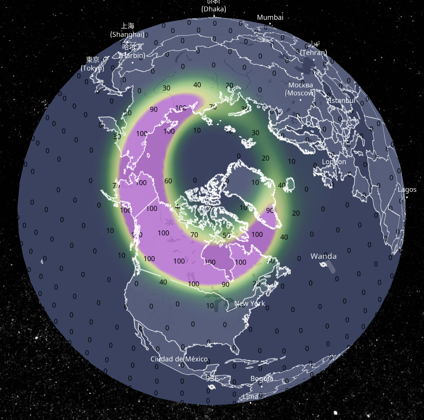 Pravděpodobnost (v %) pozorování polární záře v 10:00 dne 4. listopadu - v severní Americe jsou na řadě míst pozorovatelné