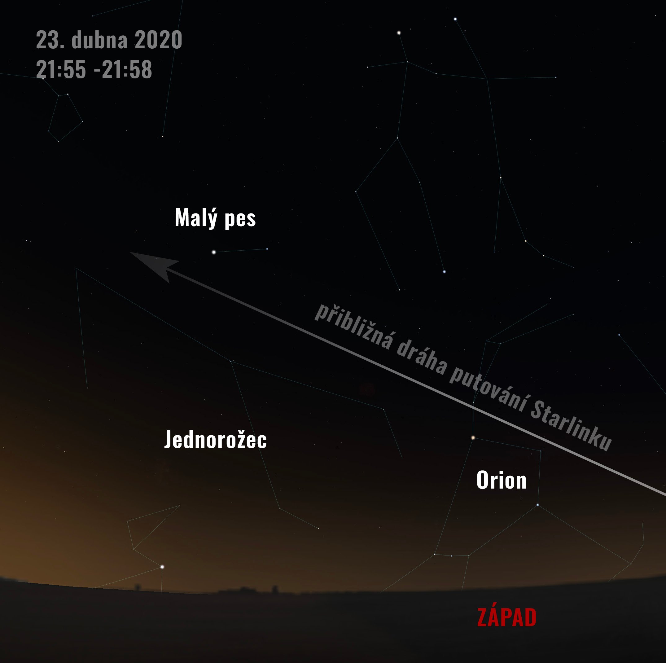 Mapa západního obzoru s vyznačením dráhy družic v čase 21:55 až 21:58