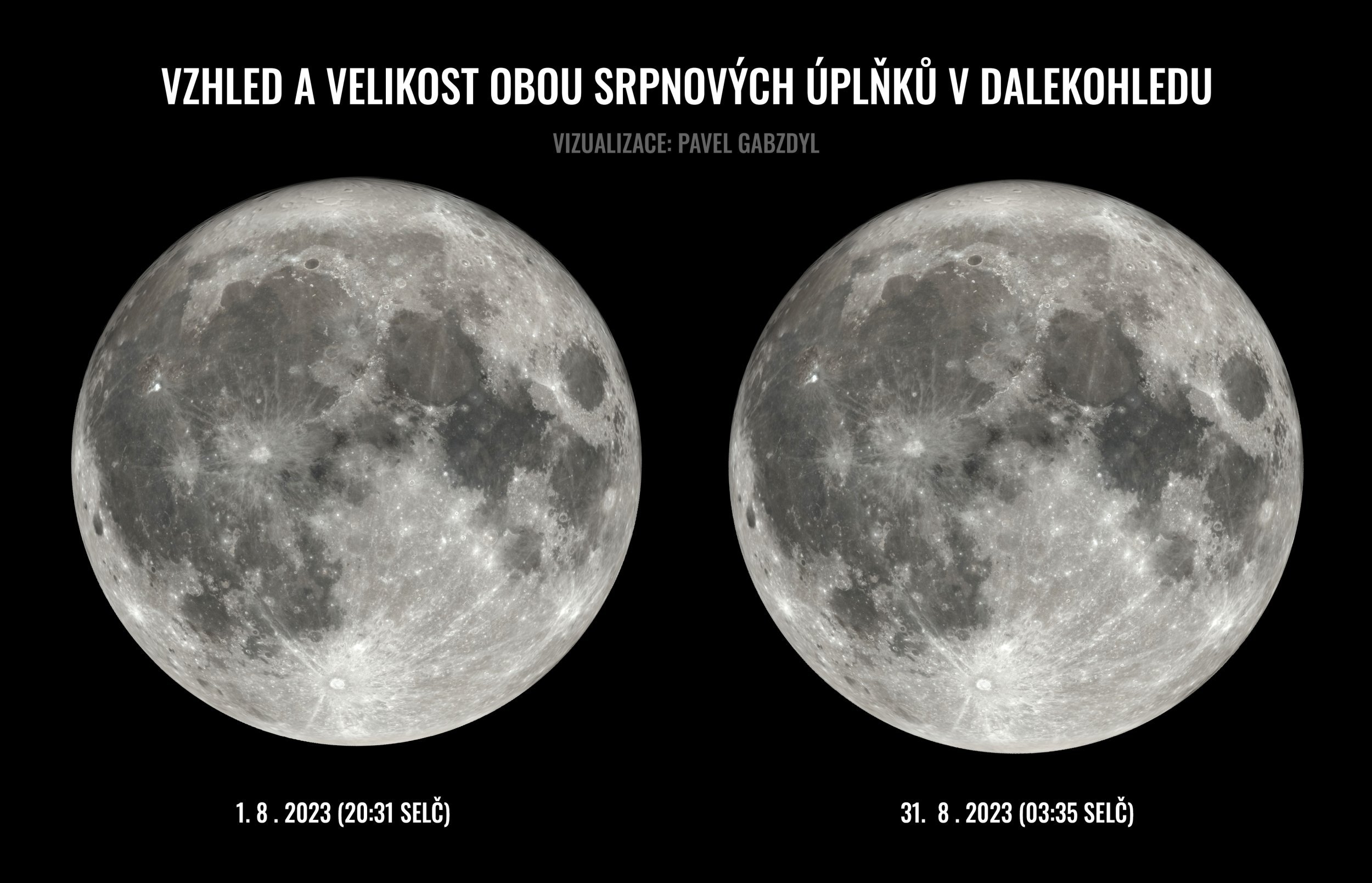 Na první pohled si jdou oba srpnové úplňky podobné jako vejce vejci. Drobné rozdíly jsou jen v natočení přivrácené strany a v jejich velikosti. Také budeme mít šanci oba Měsíce zastihnout nad obzorem téměř v přesném úplňku, kdy nejsou „ukrojeny“ ani při pohledu dalekohledem
