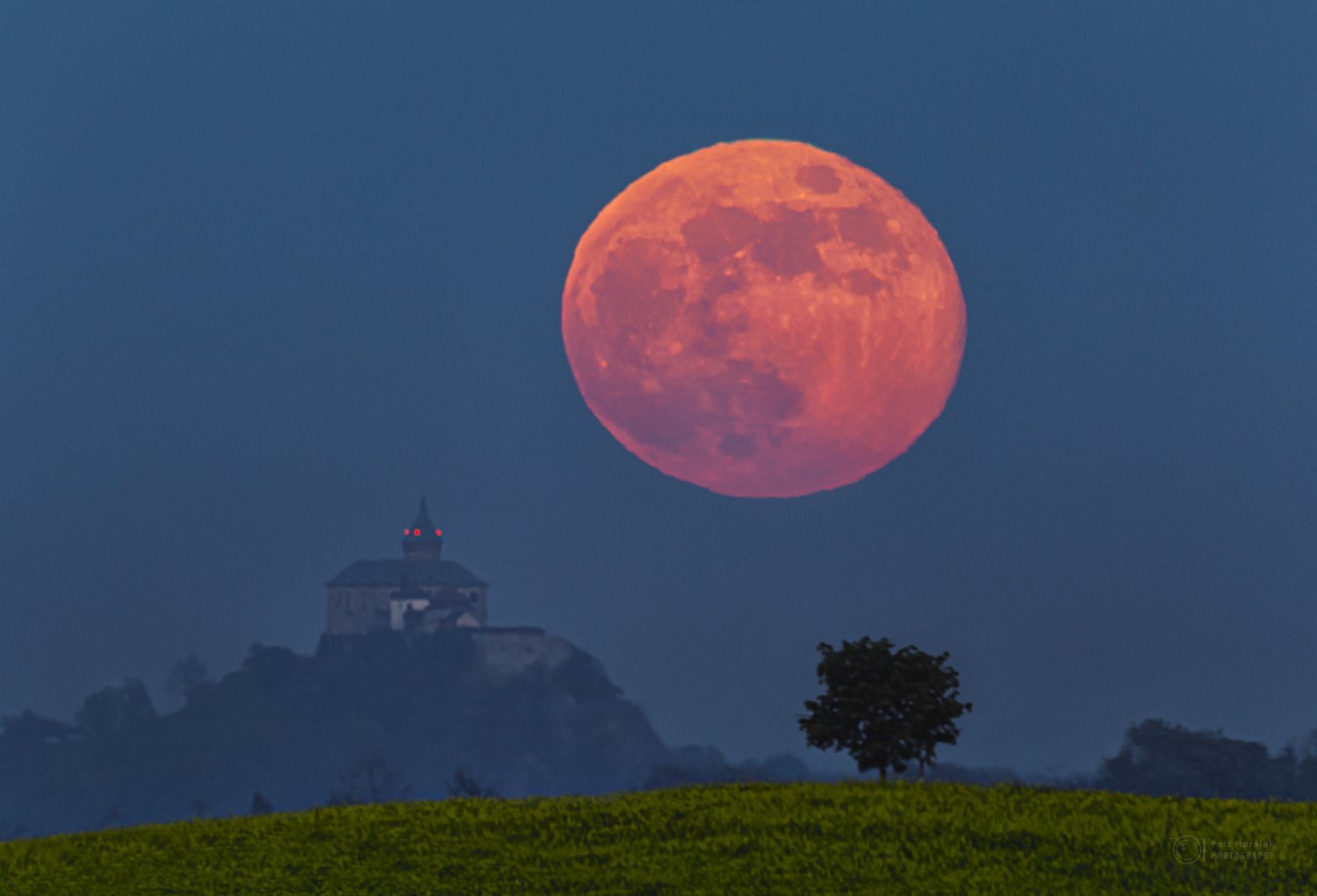 Východ „červeného“ úplňku za Kunětickou horou u Pardubic ze 7. května roku 2020
