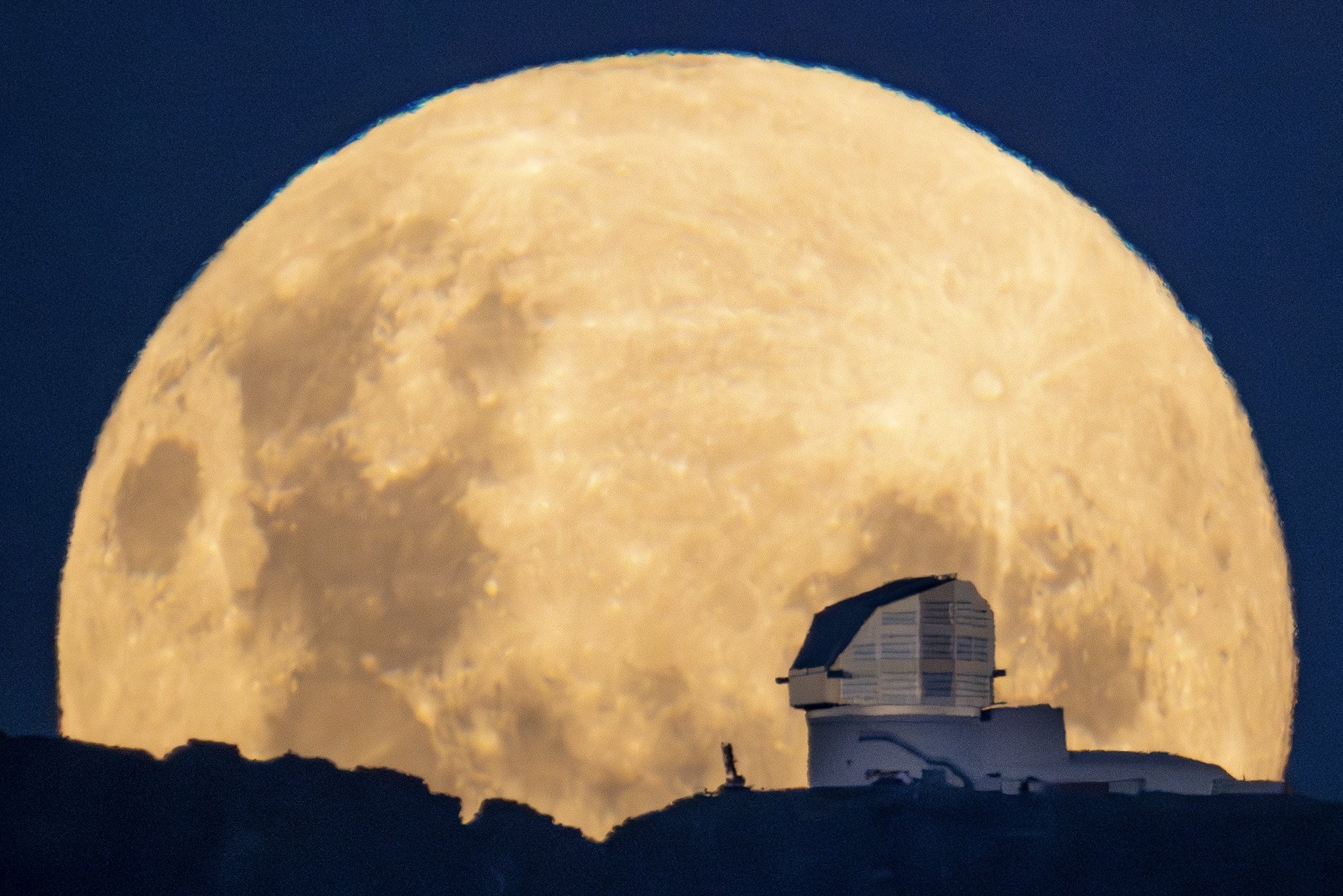 Na fotografii pořízené výkonným teleobjektivem je Měsíc nad observatoří Very Rubinové