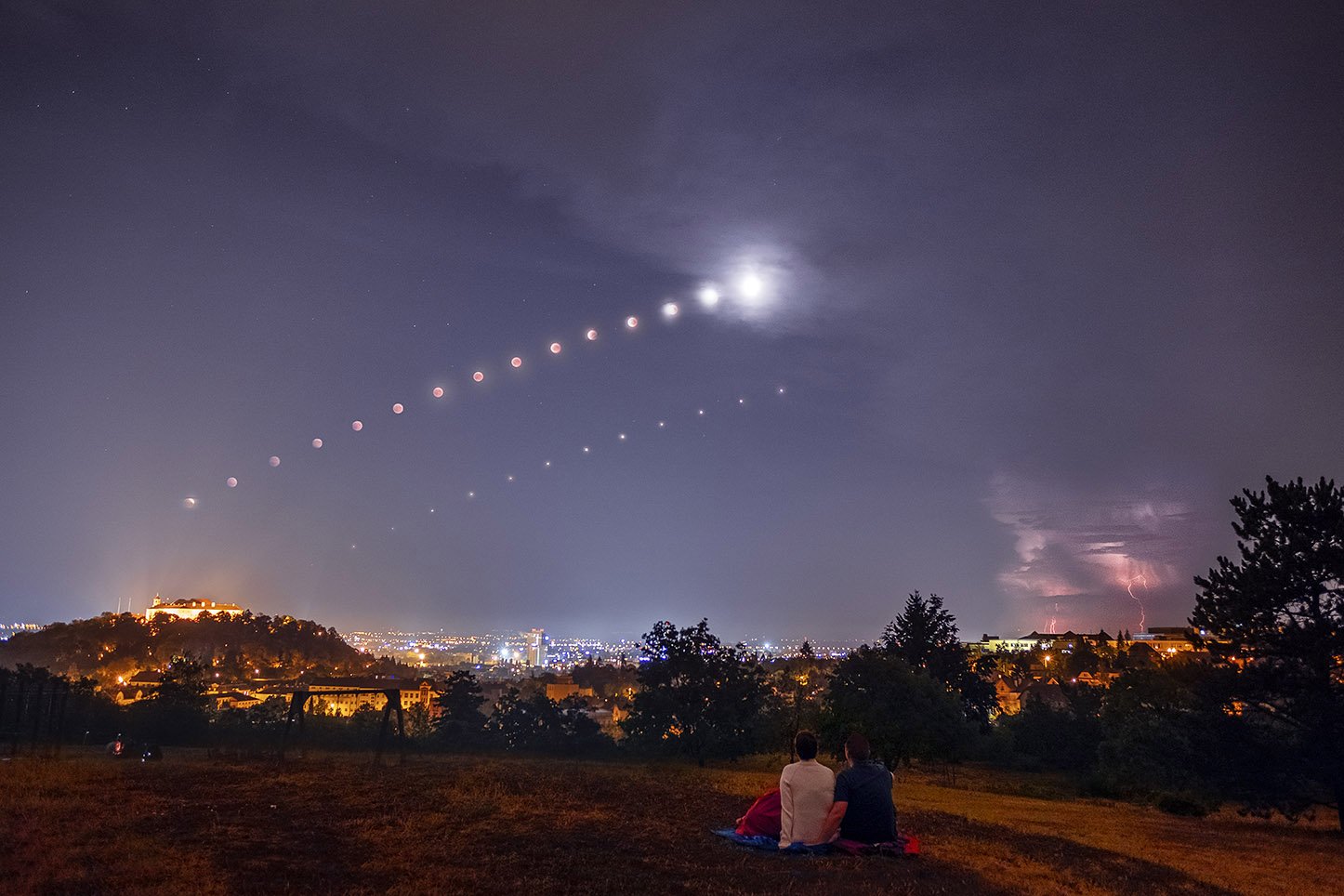 ‚Bouřlivý“ průběh úplného zatmění Měsíce nad Brnem v pátek 27. července 2018. Snímek vznikl složením celkem 25 záběrů