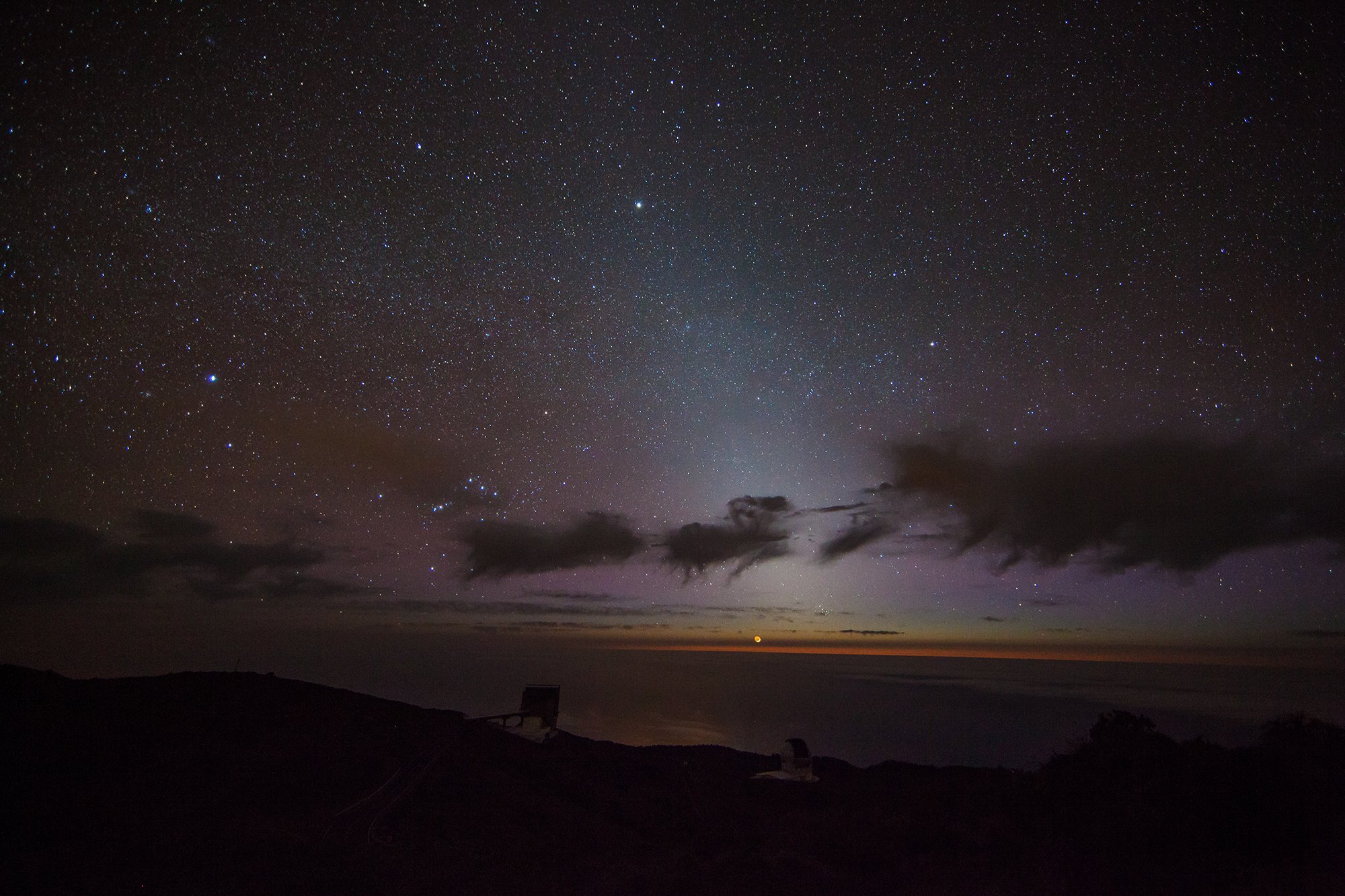 Obr. Kužel zodiakálního světla vybíhající nad oceán na ostrově La Palma. Jasný objekt u obzoru je dorůstající srpek Měsíce