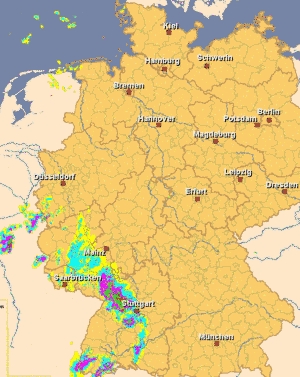 Na radarovém snímku Německa z 11:15 je vidět přeháňka u Stuttgartu. Tato přeháňka k nám za 6 hodin dorazila, ale jako silná bouřka. Zdroj: Wertter.com