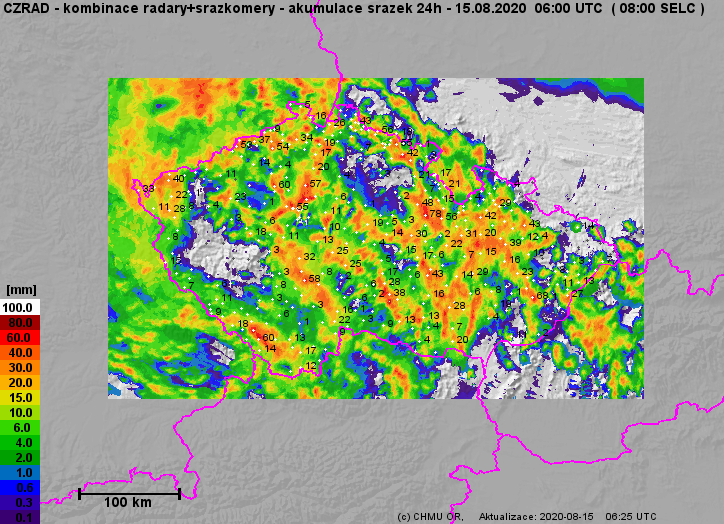 Celkové srážkové úhrny od včerejších 8:00 do dnešních 8:00