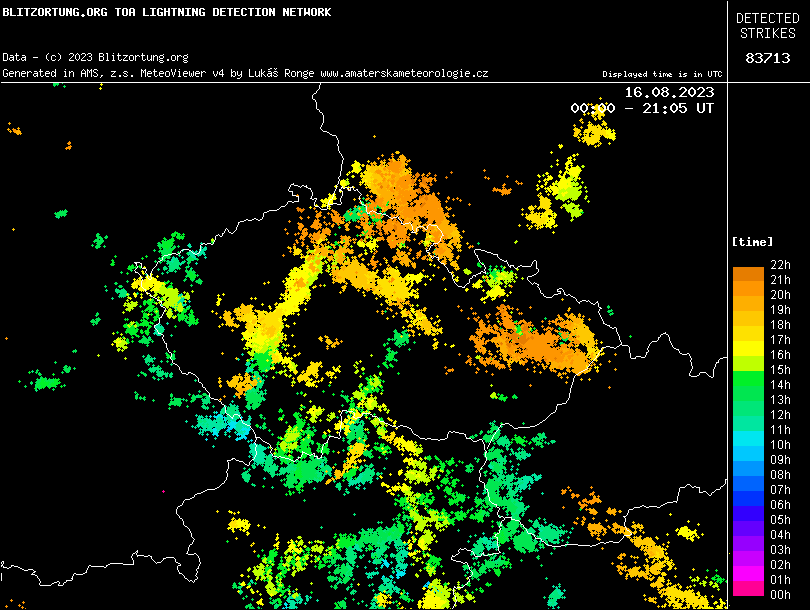Mapa blesků za středeční den, barevně odlišeny dle času