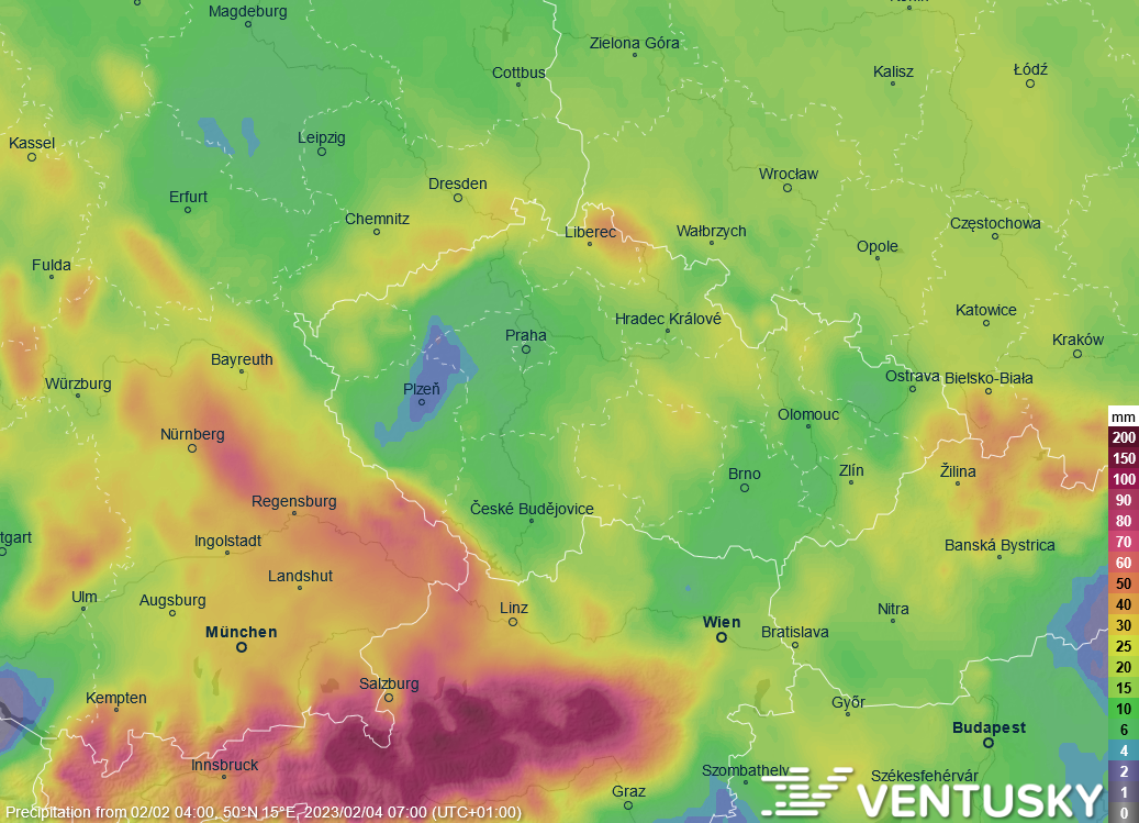 Očekávané srážkové úhrny do sobotního dopoledne - na Šumavě a v Krkonoších ještě může připadnout dalších 50 cm sněhu, na Šumavě ale v nižších polohách část srážek spadne ve formě deště
