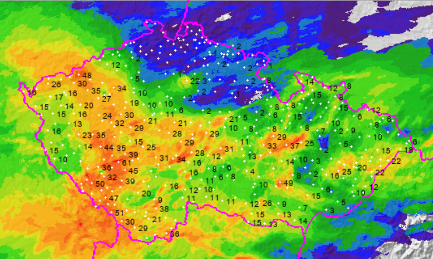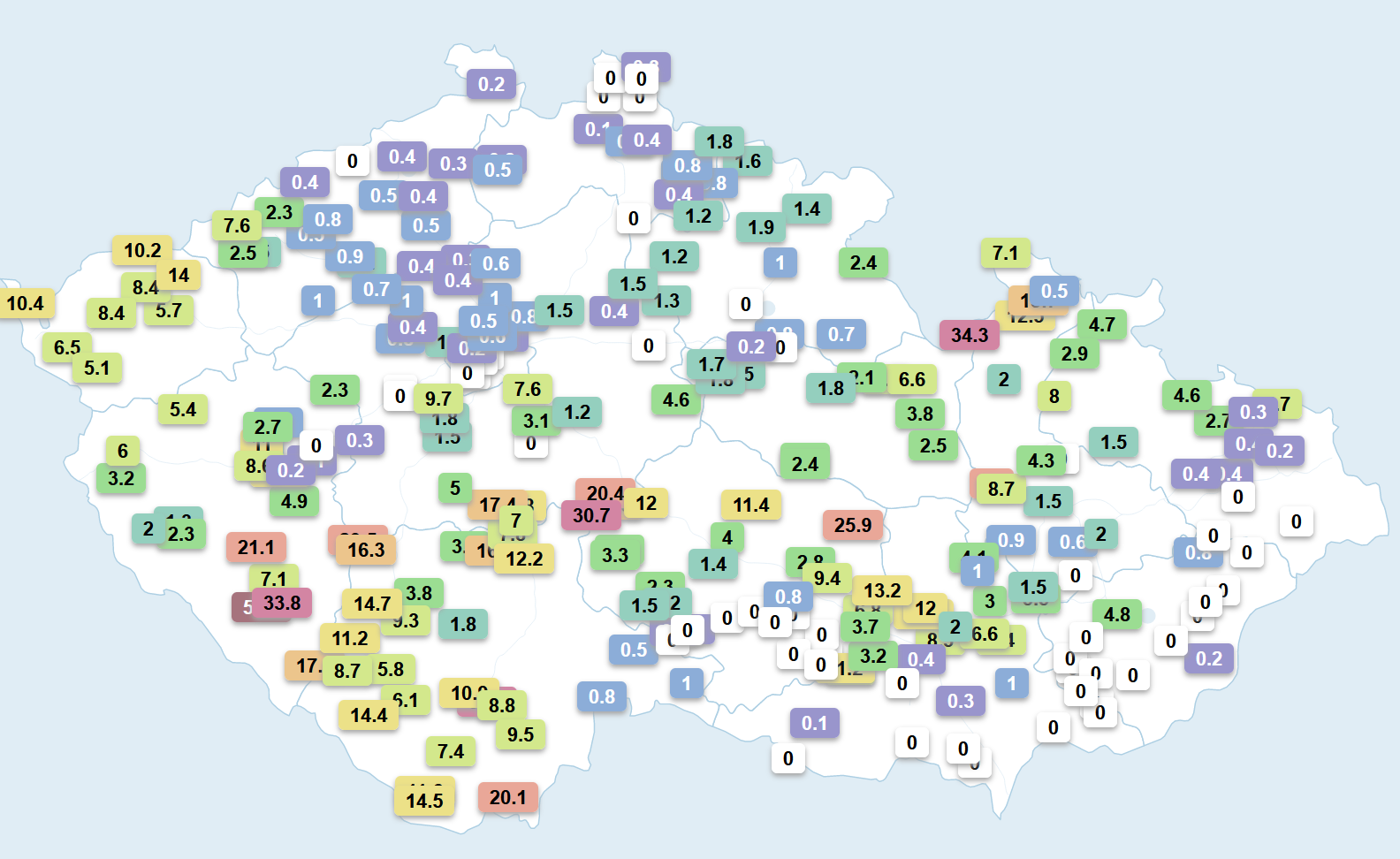 Srážkové úhrny za pondělí na meteorologických stanicích