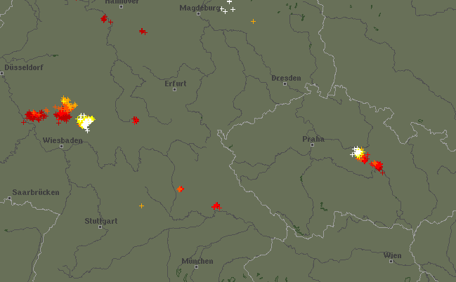 Blesky mezi 27.5.2018 20:30 až 27.5.2018 22:00 - bouřka vznikla přímo u Hradce Králově a po chvíli se opět rozpadlo - v té době se jednalo o jedinou bouřku v Česku, zdroj: Blitzortung.org