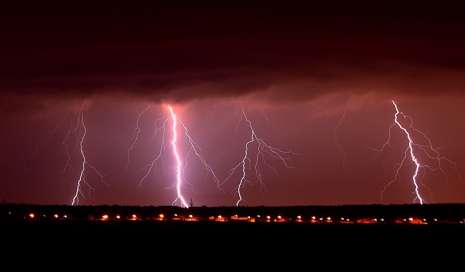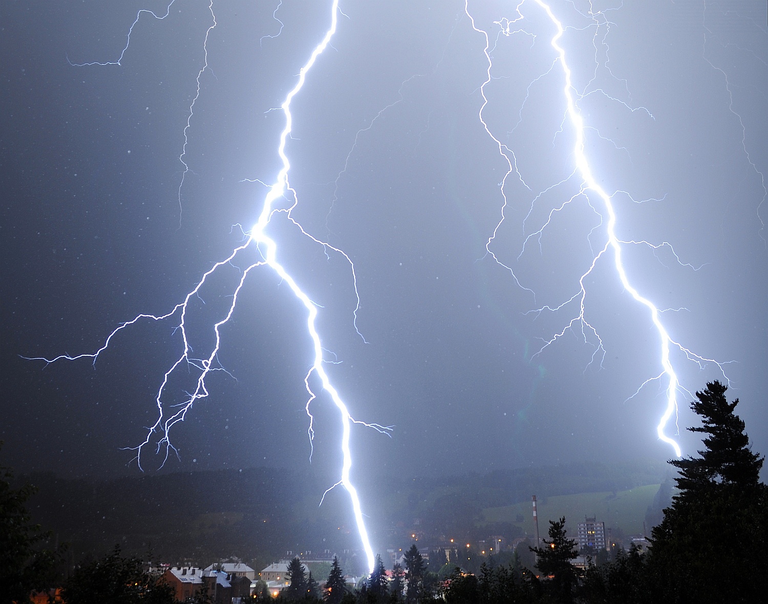 Úder blesku 2.7.2012 ve 23:56 přímo do středu Semil v Libereckém kraji, fotoaparát Nikon D5000, expozice 97/10 sekund, clona 7,1, ISO 100, autor: Tomáš Korbela Větší rozlišení