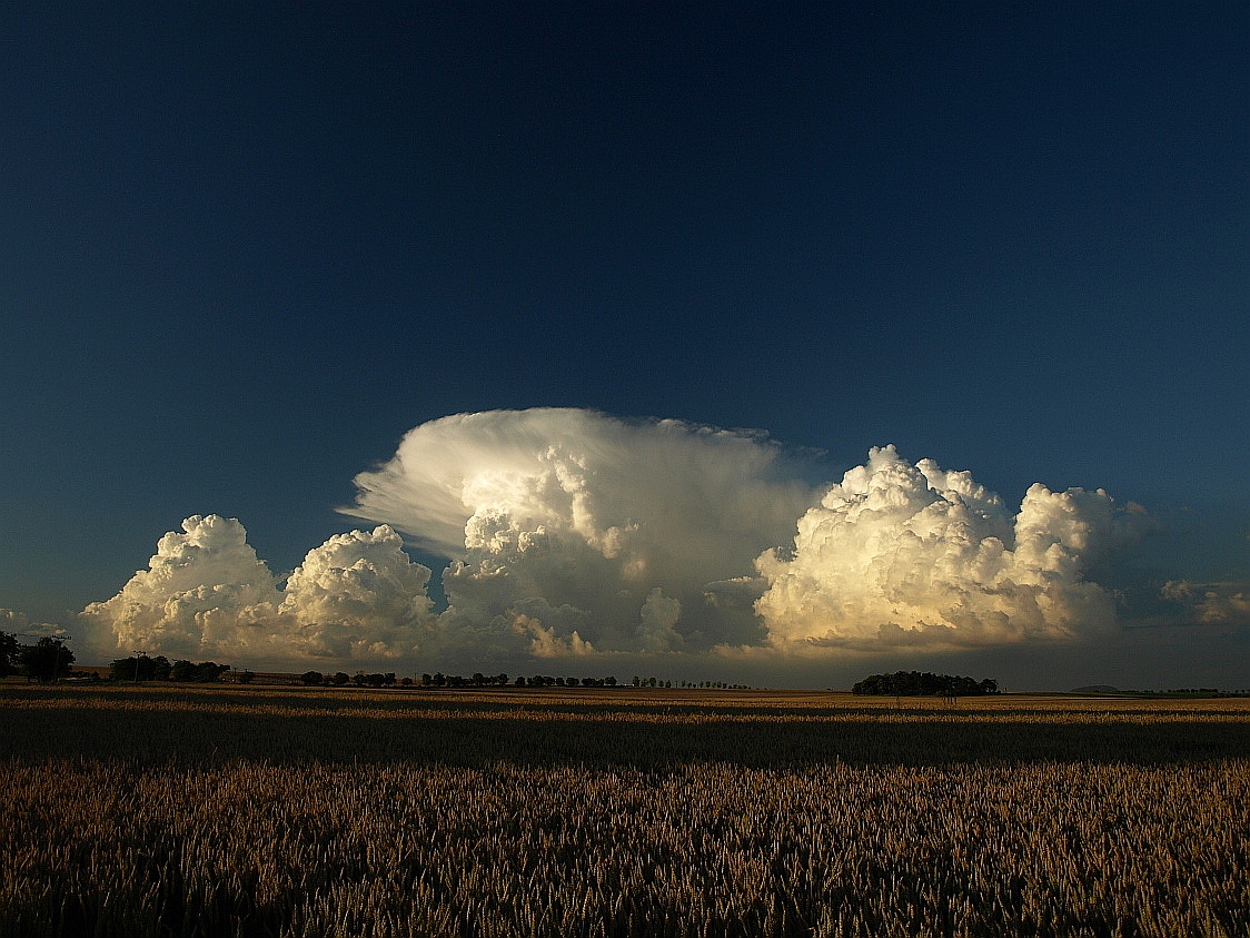 Cumulonimbus v severním pohraničí ČR, jehož vrchní část je ozářená zapadajícím sluncem 8.7.2012 21:24 - Mšené Lázně, fotoaparát Olympus E-510, expozice 1/6 sekund, clona 5,6, autor: Michal Janoušek