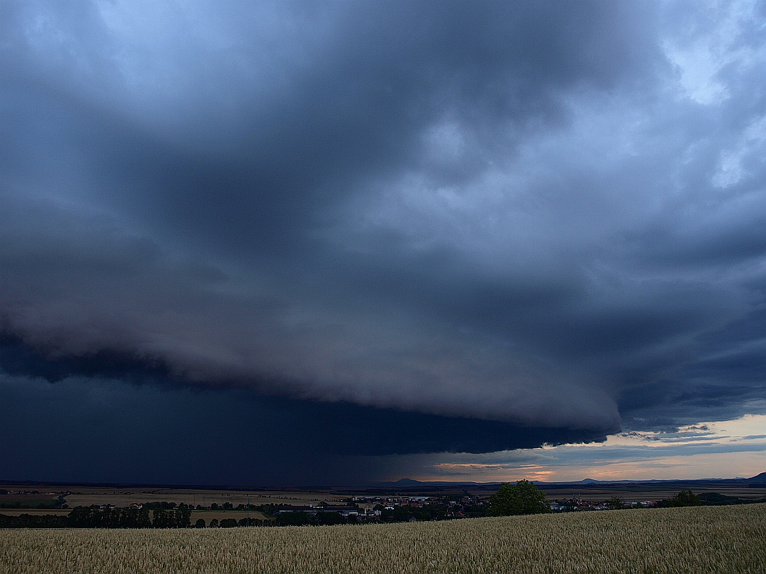 Blížící se bouřka s nápadným shelf-cloudem 15.7.2012 20:17 - Dřínov (Slaný) ve Středočeském kraji, fotoaparát Olympus E-510, expozice 1/30 sekund, clona 6,7, autor: Michal Janoušek Větší rozlišení