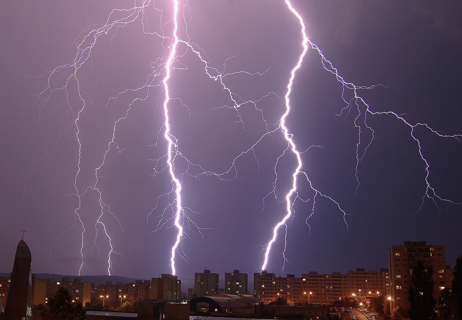 Intenzivní blesky při přechodu fronty 8.7.2012 22:33 - Košice na Slovensku, fotoaparát Nikon D40, expozice 130/10 sekund, clona 8, autor: Martin Žec Větší rozlišení