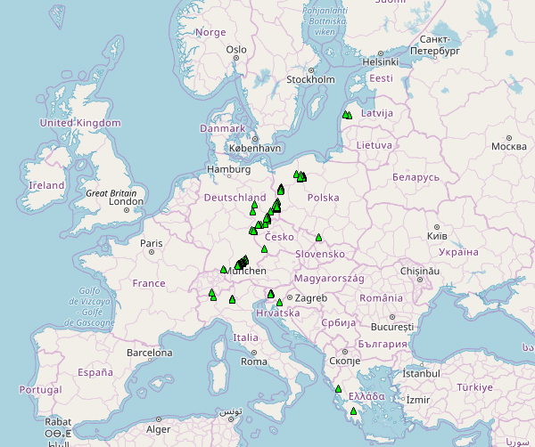 Mapa zachycuje místa (zeleně), kde se v tomto týdnu v Evropě vyskytly kroupy, zdroj: Eswd.eu