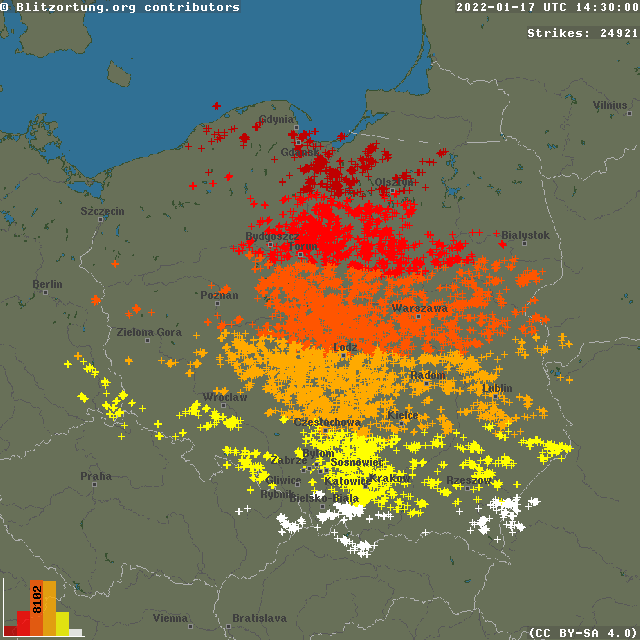 Množství blesků od dnešních 6:00 do 15:30 - v Polsku uhodilo přes 20 000 blesků, několik výbojů se vyskytlo i u nás