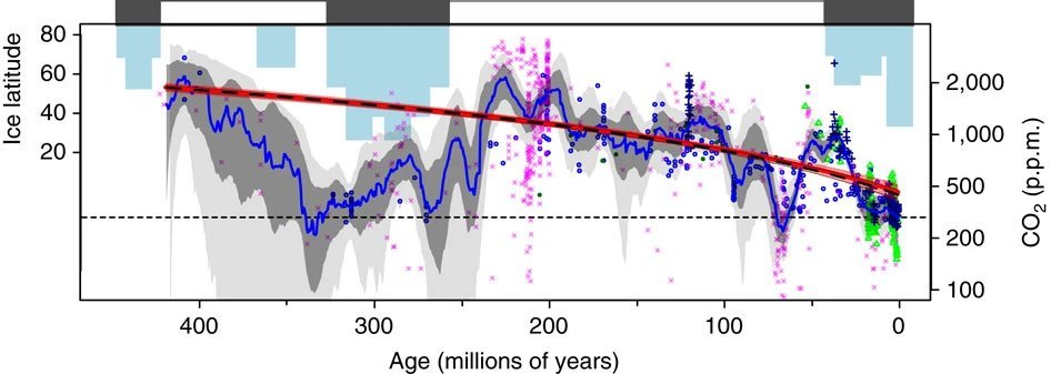 Rekonstrukce vývoje teploty za posledních 500 miliónů let (stupnice je uvedena ve °F, přepočet na °C je 60 °F = 15,6 °C, 70 °F = 21,1 °C 80 °F = 26,7 °C, 90 °F = 32,2 °C)