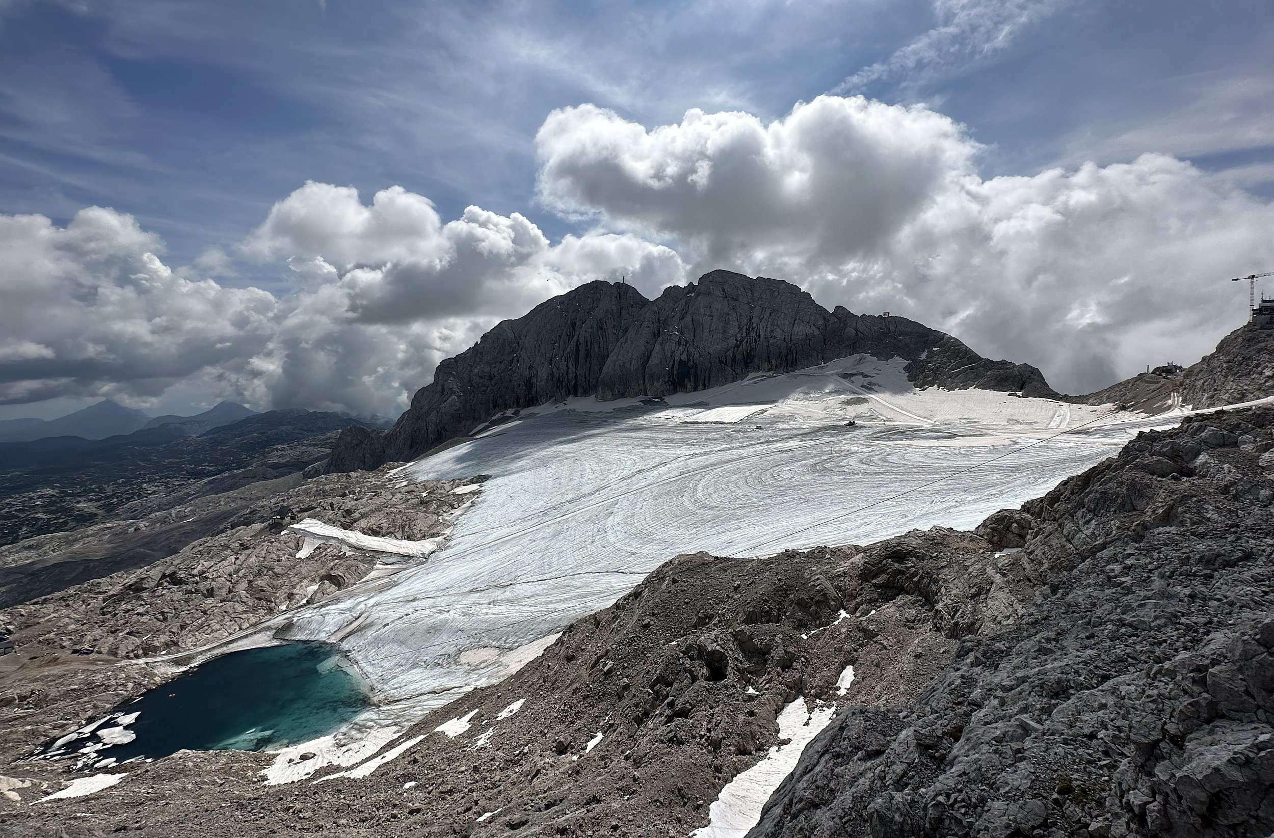 Schéma vývoje ledovce Schladminger od roku 1850 do roku 2012 - odlišeno barevně. Kolem roku 1850 se nacházel v černě označených oblastech, nyní je jeho velikost zhruba poloviční