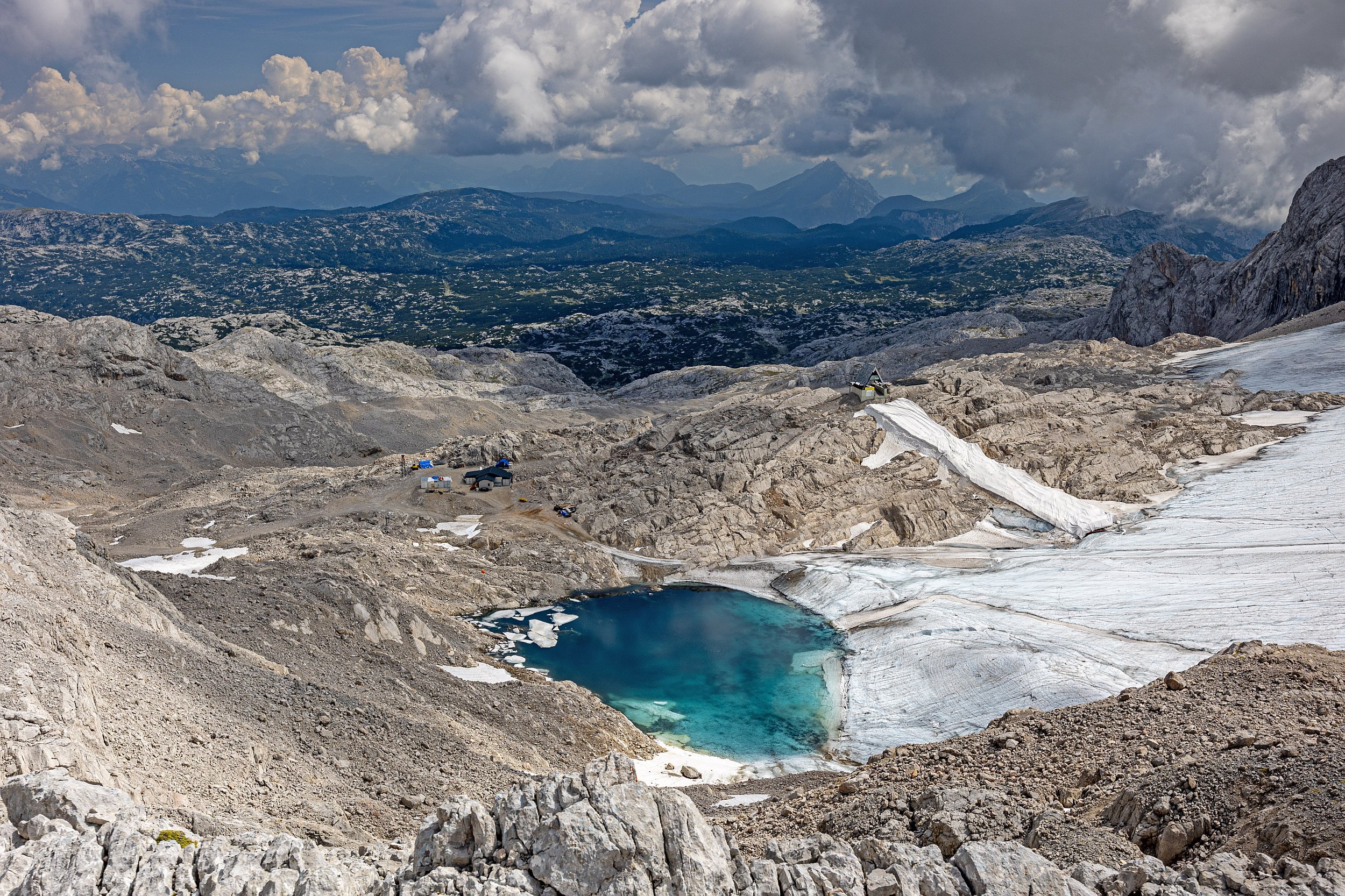 Pohled na ledovec Schladminger z 18. srpna 2023 - oblouky na povrchu ledovce svědčí o jeho neustálém pohybu, který je nerovnoměrný (nejnižší je po stranách a na bázi ledovce)
