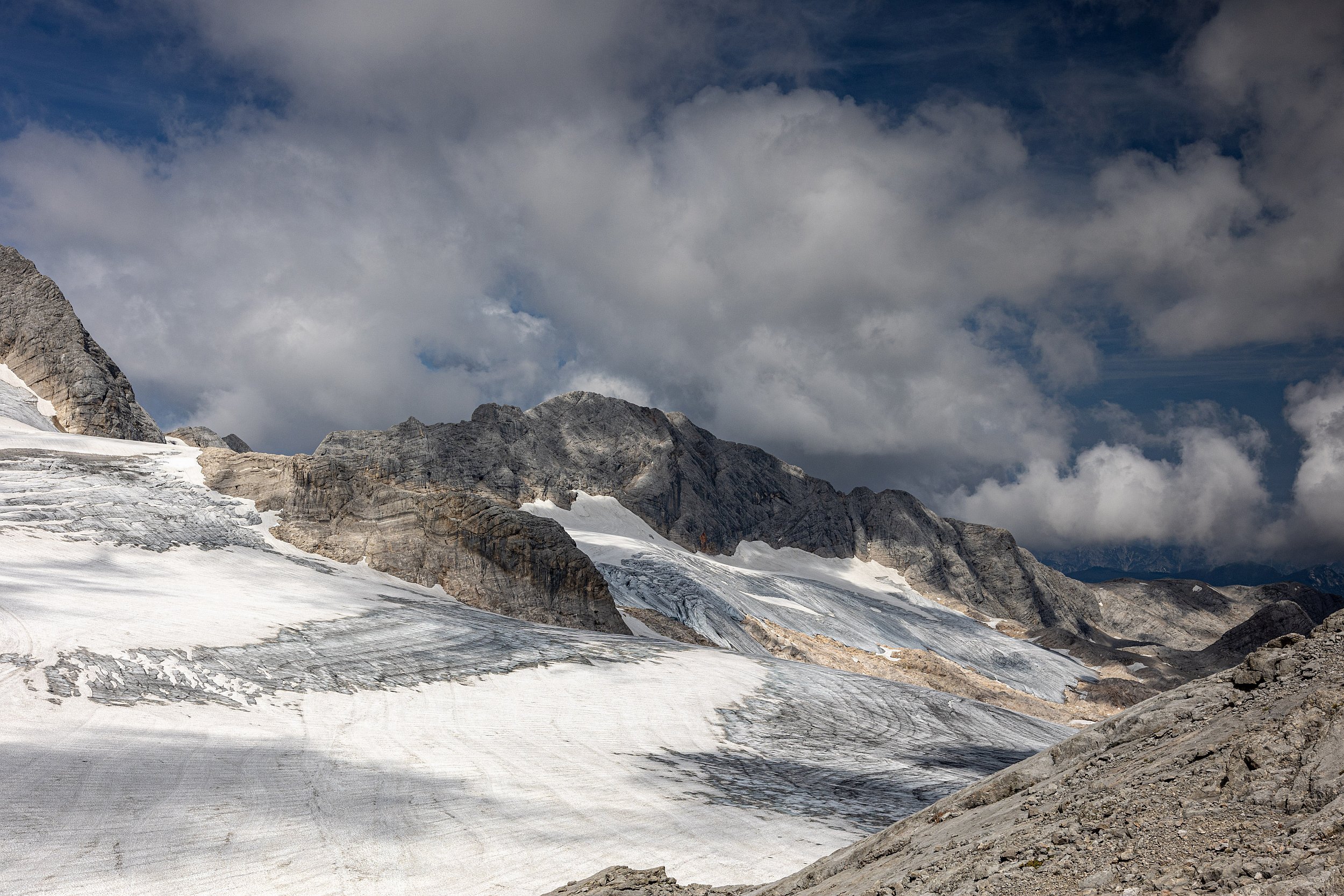 Ledovce Hallstätter z 18. srpna 2023 - přítomnost prachu (nyní hlavně saharského, dříve šlo hodně i o černý uhlík) na ledovci zrychluje jeho tání