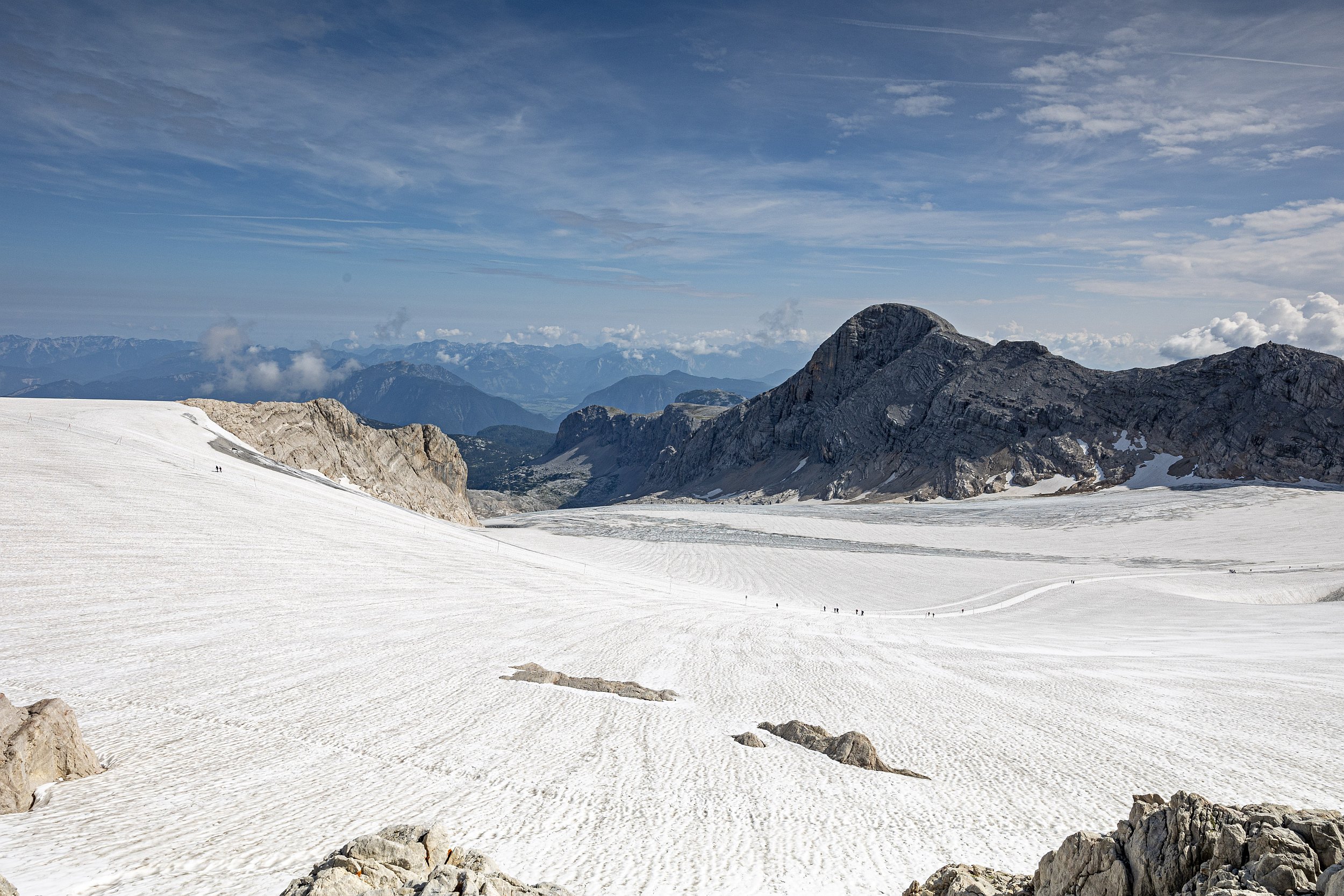 Pohled na ledovec Hallstätter a jeho změny za 13 let - jeho výška klesla o několik metrů a postupně se tak objevují větší části skal, upraveno dle ANISA.at