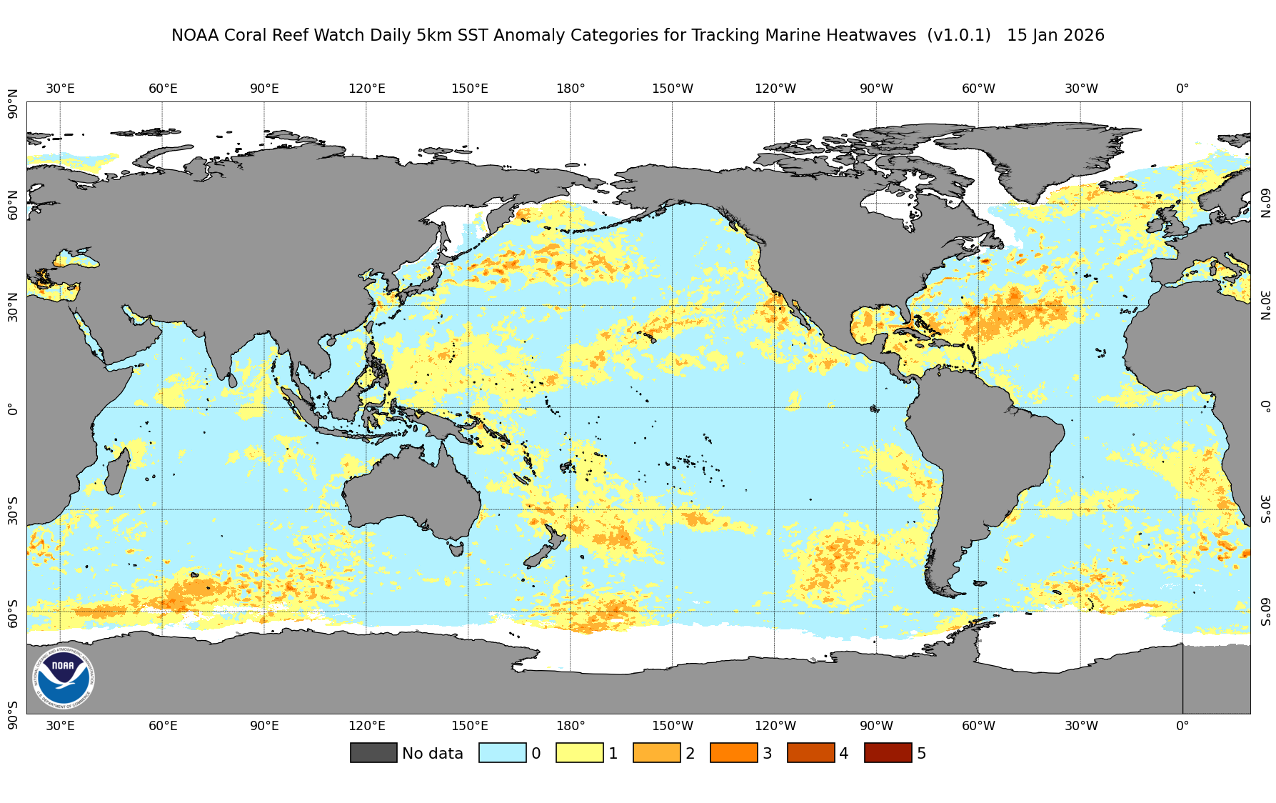 Mořské horké vlny - aktuální situace ve světě, kategorie 1 znamená vlnu mírné, 2 silné, 3 velmi silné a 4 extrémní intenzity