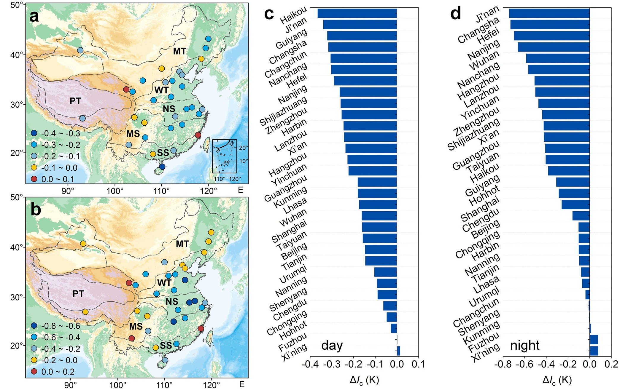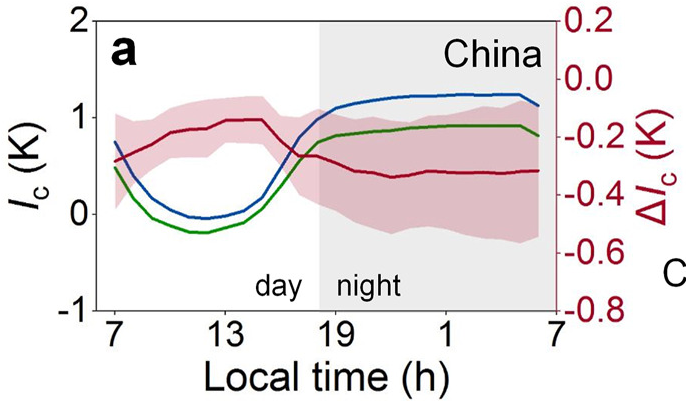 Průměrná změna intenzity MTO pro vybraná čínská města z různých klimatických regionů (viz vlevo) v denních (uprostřed) a nočních (vpravo) hodinách vyjádřené v Kelvinech (což odpovídá °C)