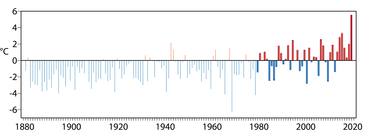 Obr. 2: Odchylka průměrné teploty vzduchu v jednotlivýh letech pro západní Sibiř od průměru 1981-2010 (za období leden až květen)