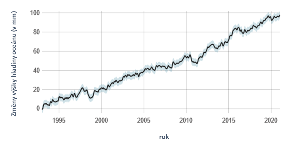Změna hladiny oceánů od roku 1990 do současnosti (podle družicových dat)
