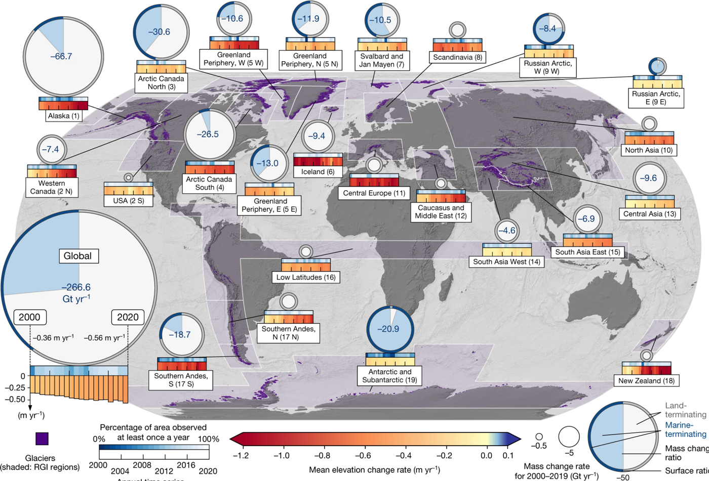 Průměrný roční úbytek ledovců (fialový nádech mapy) za posledních 20 let (modrá čísla v kolečkách, v miliardách tun). Uvnitř disku je znázorněn příspěvek k celkové míře změny (příslušným klínem) ledovců na pevninách (světle šedou barvou) a ledovců končících v moři (modře). Vnější prstenec pak udává podíl celkové plochy těchto dvou typů ledovců. Z toho například vyplývá, že i když oceány končící v moři (často ve fjordech) představují asi 40 % celkové plochy zaledněné oblasti, přispívají pouze 26 procenty k celkovému úbytku hmoty ledovců. Pod kolečky je pak barevně znázorněna průměrná změna nadmořské výšky v důsledku tání ledu v metrech za rok – viz legenda dole pod obrázkem