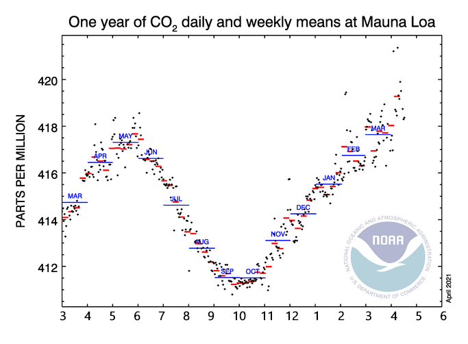 Denní a týdenní hodnoty oxidu uhličitého na observatoři Manua Loa za poslední rok - na svislé ose jsou jednotlivé měsíce od března 2020 do jara 2021