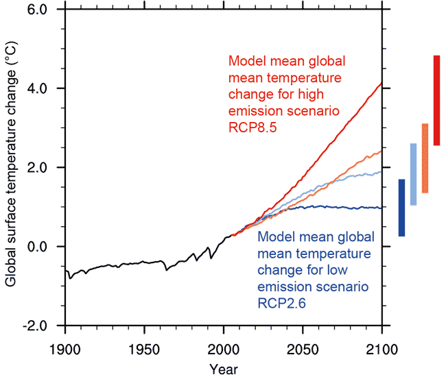 Obr. 5: Pozorované a očekávané změny globální průměrné teploty na Zemi pro různé emisní scénáře (tedy scénáře vývoje množství produkovaných emisí skleníkových plynů) do konce tohoto století podle IPCC. Změny jsou vztaženy k průměru za období 1986-2005, zdroj: IPCC