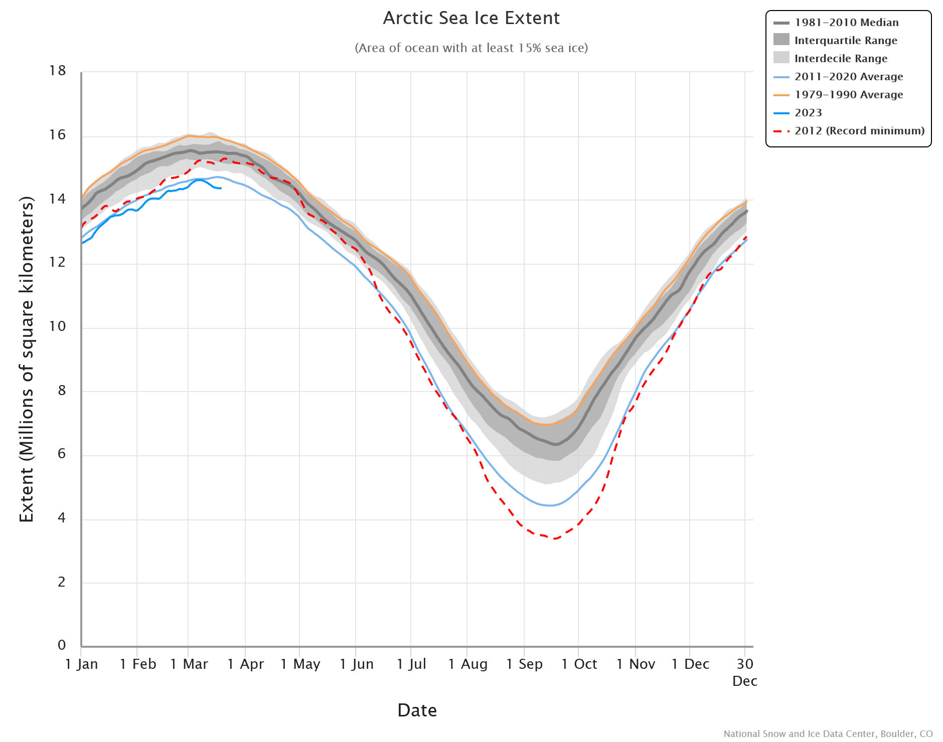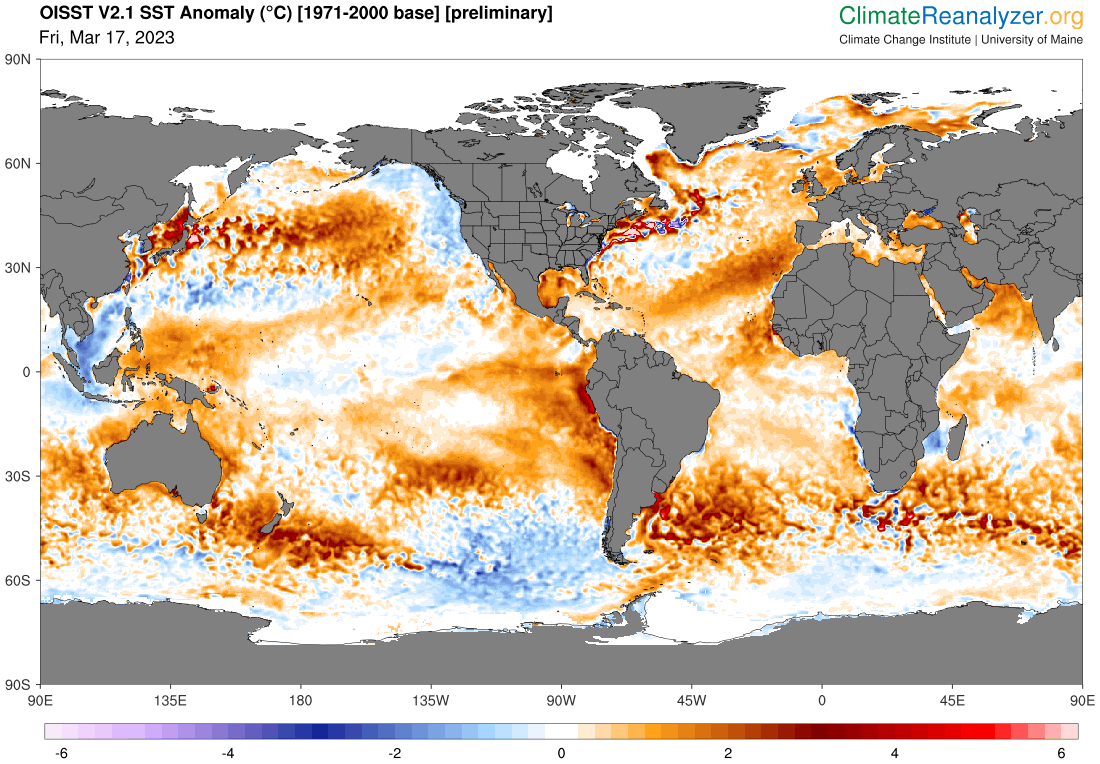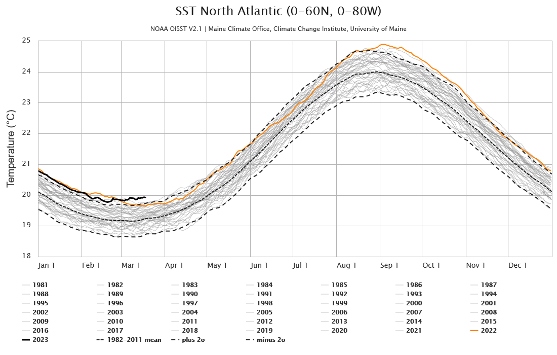 Vývoj povrchové teploty vody v severním Atlantiku v jednotlivých letech - černou čarou je znázorněn letošní rok, oranžovou potom minulý a šedými zbylé roky