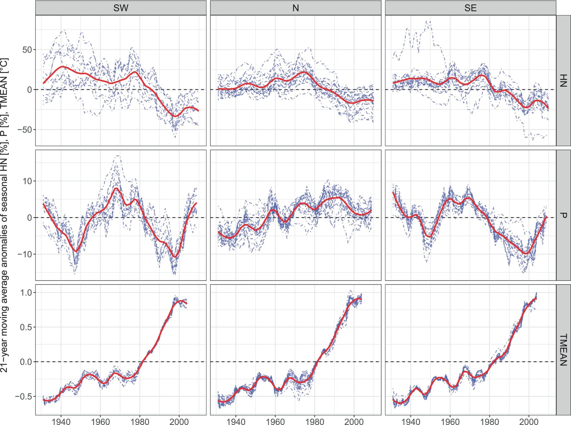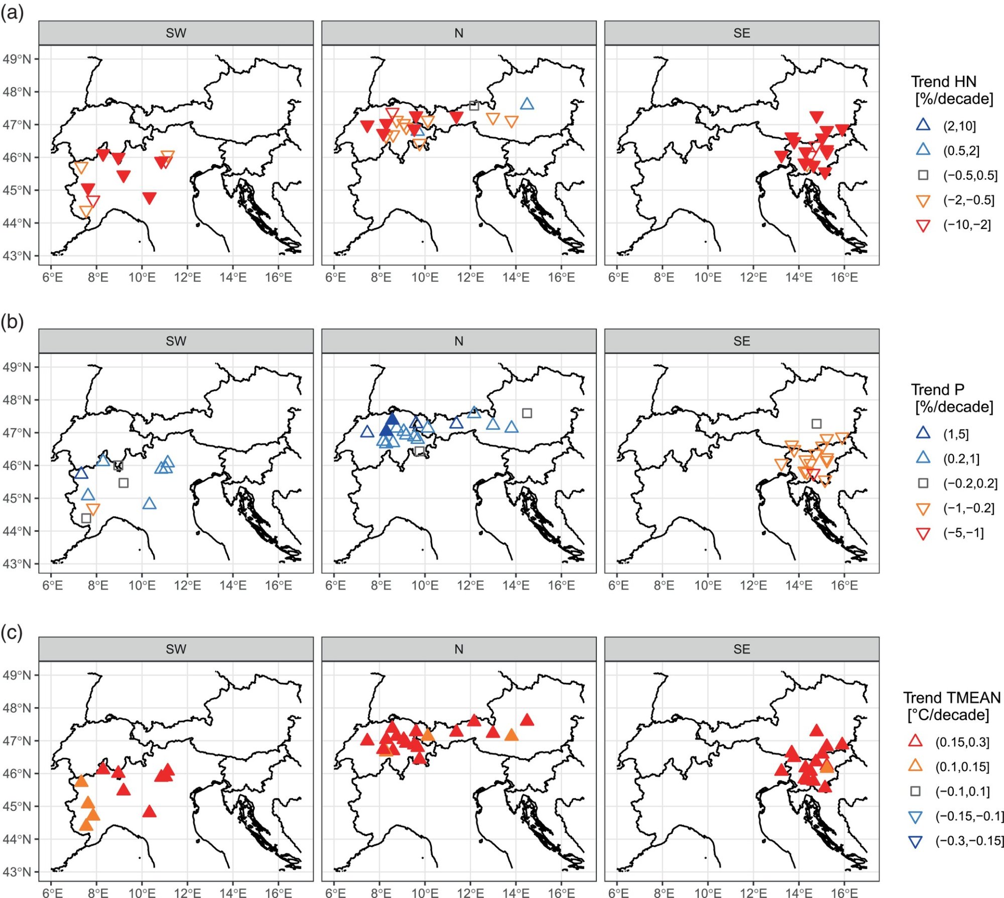 Rozdělení oblastí Alp (resp. stanic) na jihozápadní (modré tečky), jihovýchodní (červené) a severní (zelené tečky)