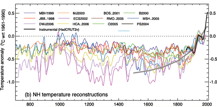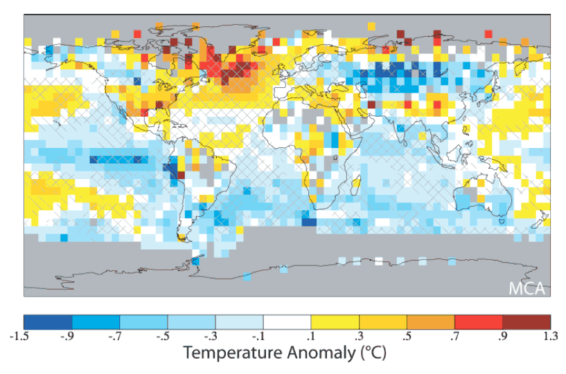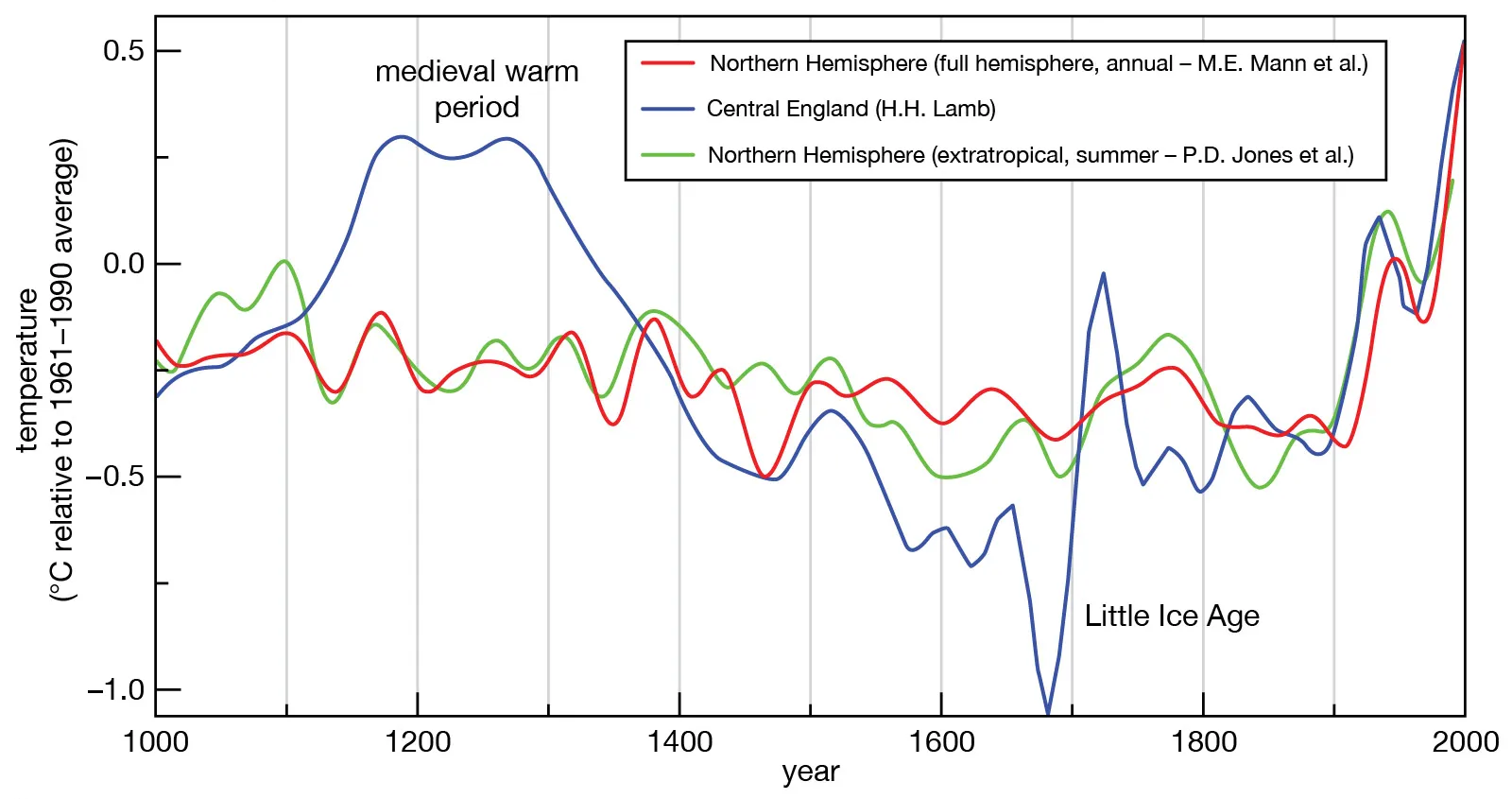 Rekonstrukce teplotních odchylek oproti průměru 1961-1990 pro tři oblasti - modře centrální Anglie, červeně severní polokoule a zeleně mírné oblasti severní polokoule v létě. Je patrné, že středověké teplé období se projevilo výrazně jen regionálně v Anglii, kde se i například rozšířila oblast, kde bylo možné pěstovat víno. Naopak významný globální vliv na průměrnou teplotu toto období nemělo