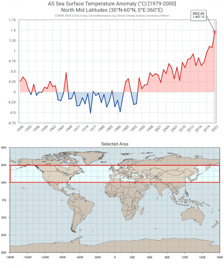 Vývoj průměrné povrchové teploty mořské vody v pásu mezi 30. a 60. stupněm severní šířky od roku 1950, zdroj: climatereanalyzer.org
