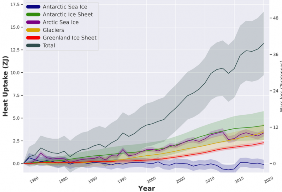 Teplo pohlcené ledovci (levá osa) a množství roztálého ledu (pravá osa), zdroj: essd.copernicus.org