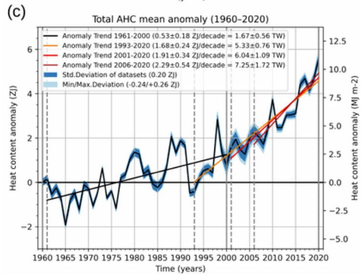 Vývoj množství tepla pohlceného atmosférou od roku 1960 a srovnání průměrného trendu za různá období, zdroj: essd.copernicus.org