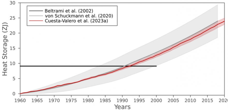 Nárůst tepla uloženého v pevném zemském povrchu od roku 1960, zdroj: essd.copernicus.org