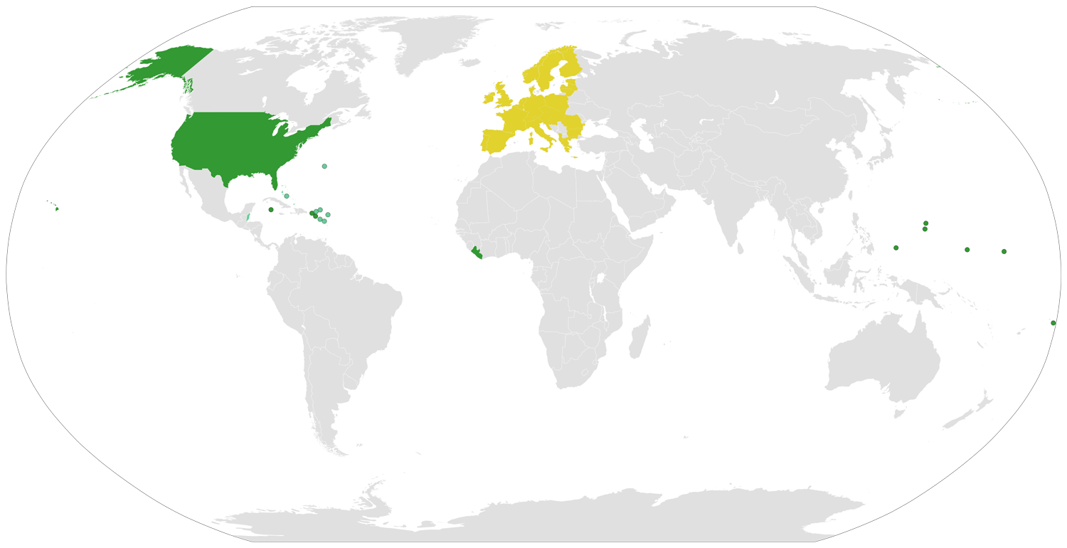 Mapa zemí, kde jsou primárně využívány stupně Fahrenheita - zeleně nyní a žlutě od roku 2025, kdy dojde k jejich zavedení v Evropské unii