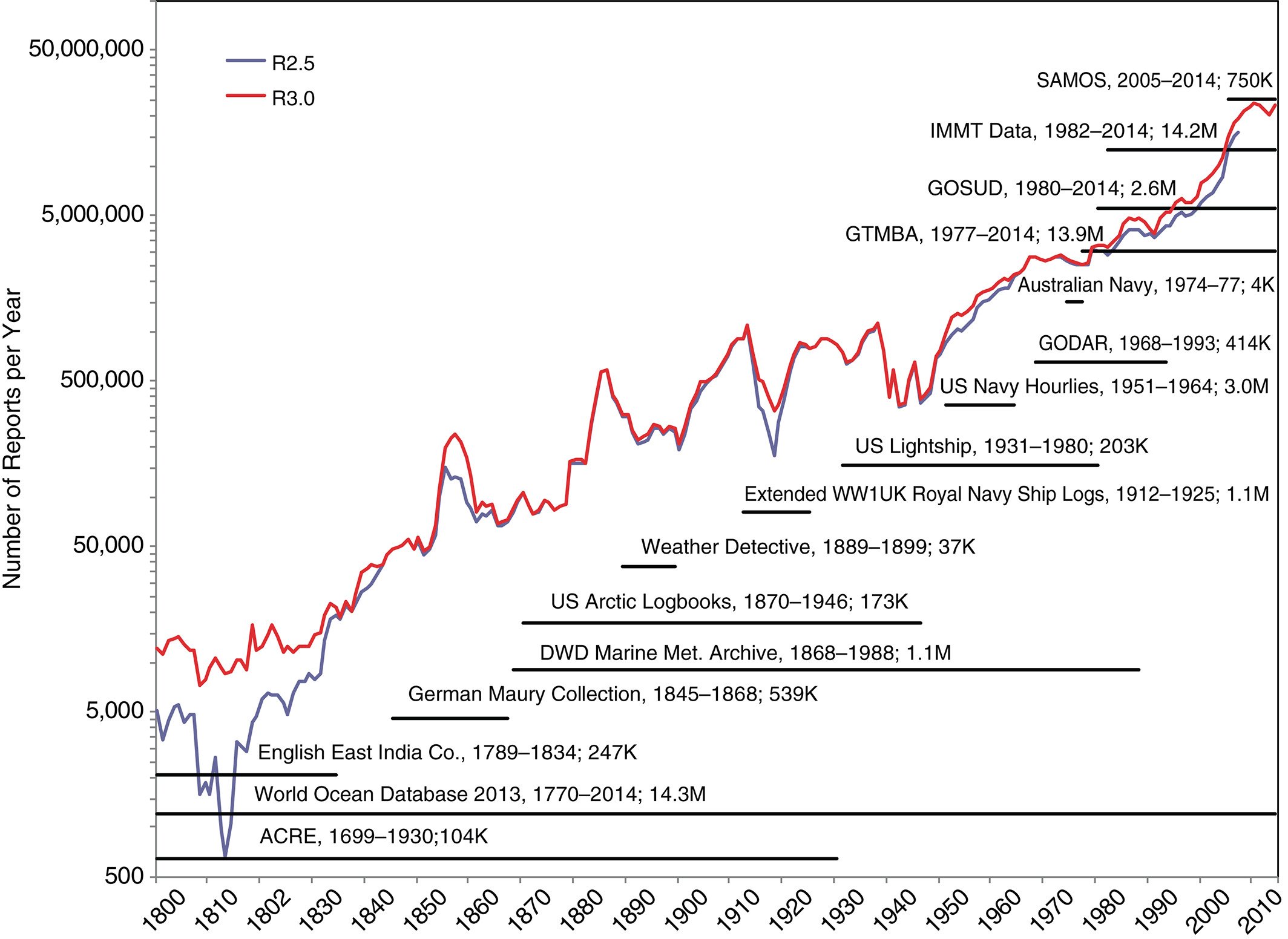 Počet hlášení za rok zpracovaných v databázi ICOADS pro období 1800-2014