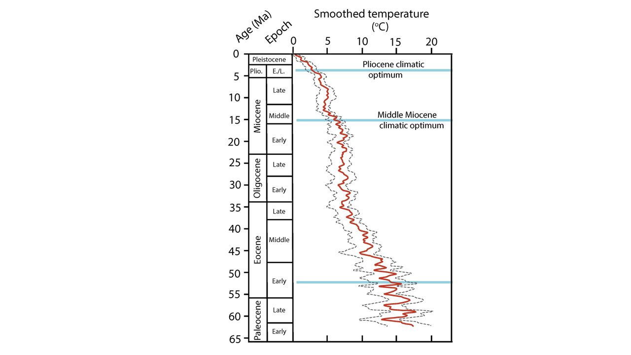 Příklad rekonstrukce vývoje teploty vody tropických moří pro Indický oceán a západní Pacifik založené na datech získaných z korálů pro období od roku 1600 do roku 2000 (čárky na dolní ose značí úseky po 50 letech)