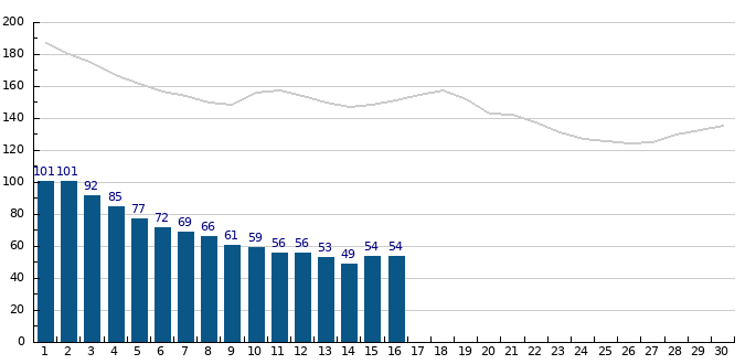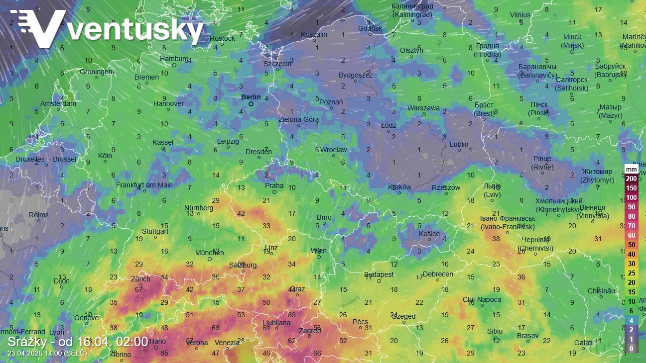 Výška hladiny Moravy v Lanžhotě - oproti dlouhodobému průměru (šedivá křivka) je hladina asi o metr níže