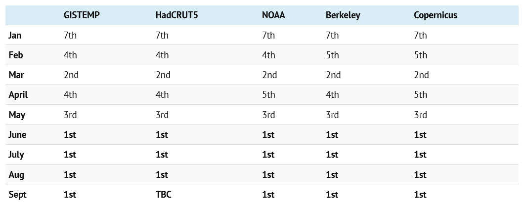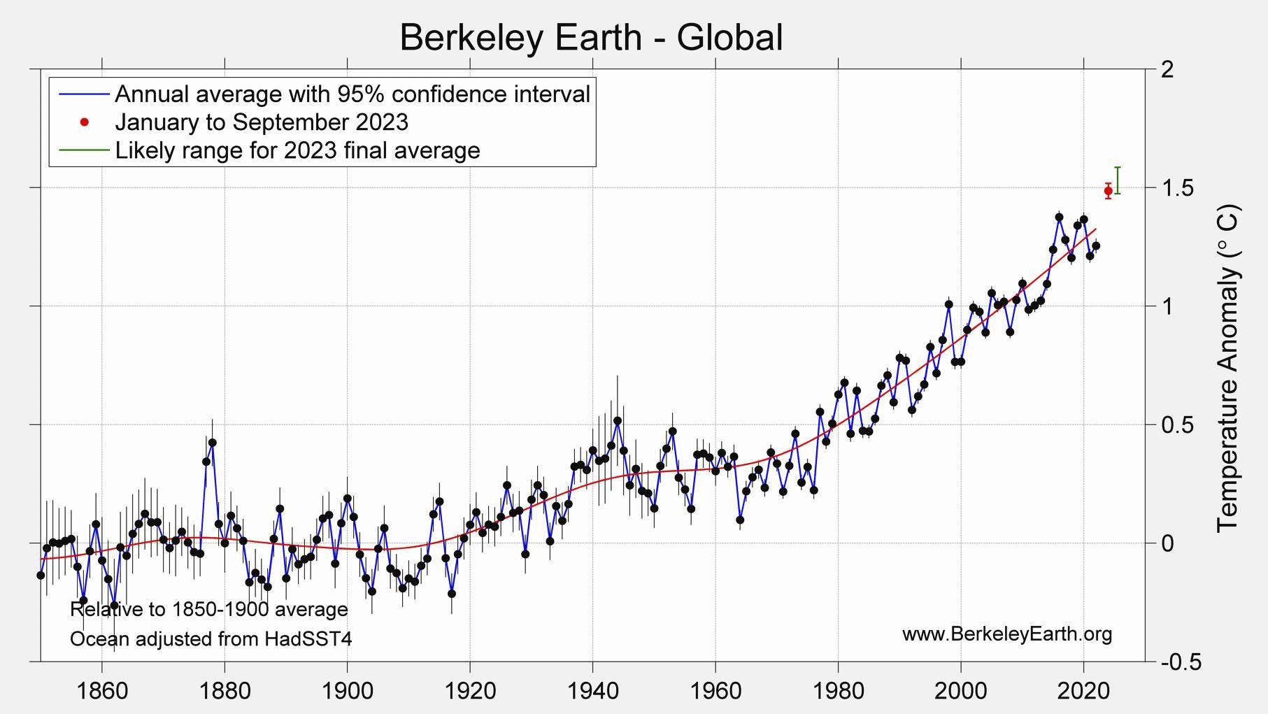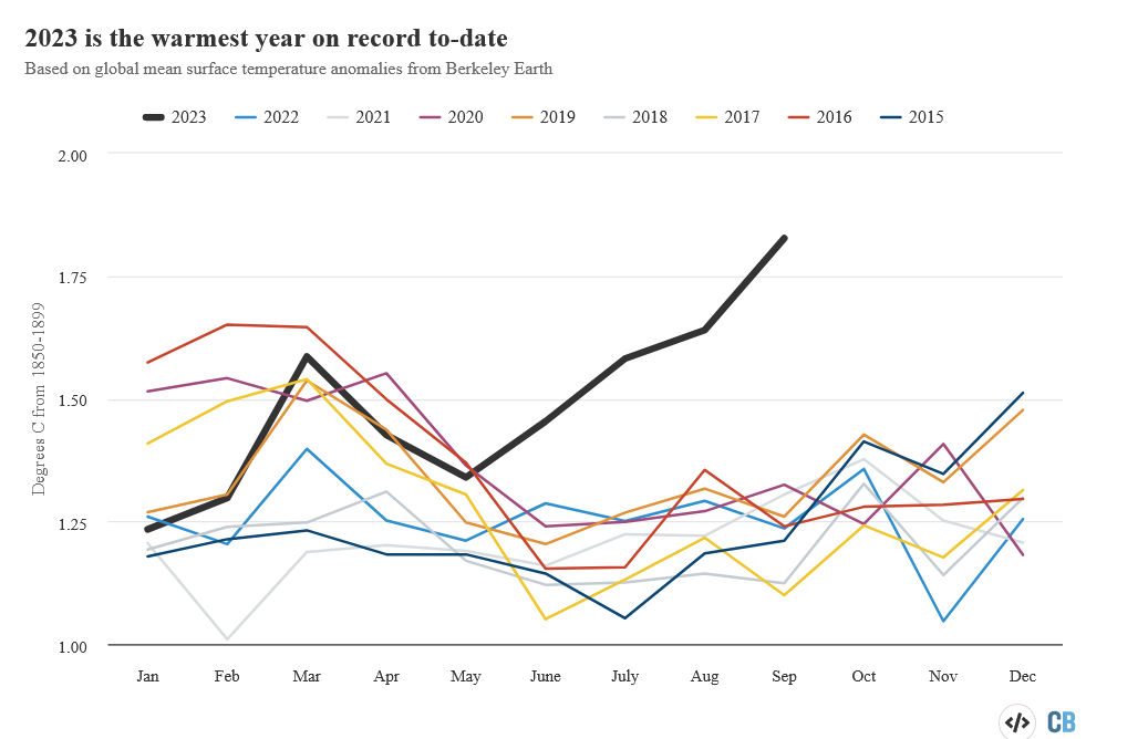Odchylky globální teploty vzduchu pro každý měsíc v období 2015-2023 (vůči období 1850-1899)