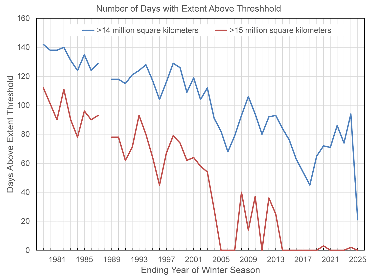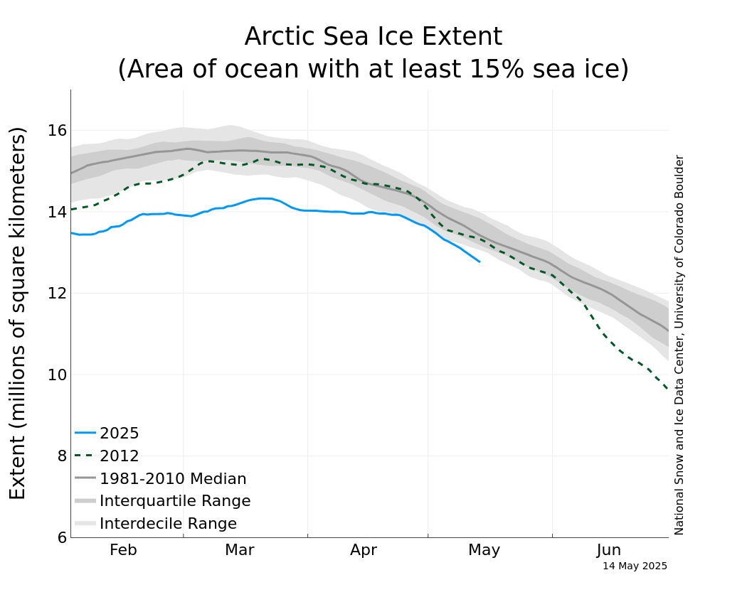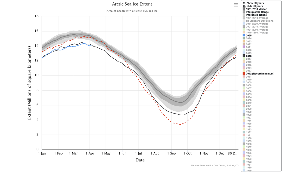 Rozsah mořského ledu v Arktidě od začátku roku (modrou čárou) a srovnání s průměry (šedě) - letošní rok je rozsah zalednění nejnižší za dobu měření